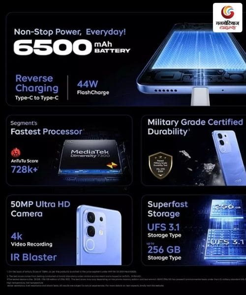 - दमदार बैटरी और फास्ट चार्जिंग: 6500mAh की बैटरी और 44W फास्ट चार्जिंग से दिनभर उपयोग.